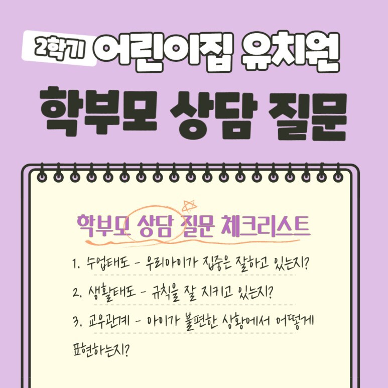 학기초에 학부모 상담에는 학부모가 선생님에게 우리 아이의 특성, 생활습관, 보육시 주의해야 할 점(알러지) 을 알려주는것이 주가 되었다면 2학기 학부모 상담은 아이가 원에서 잘 생활하고 있는지에 대한 전반적인 피드백을 받는 시간입니다. 시간은 15~20정도 인데 우리 아이 이야기를 나누다 보면 시간이 많이 부족해요. 그래서 학부모 상담시 어떤 질문을 하면 좋을지 정리 해봤어요^^